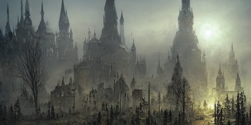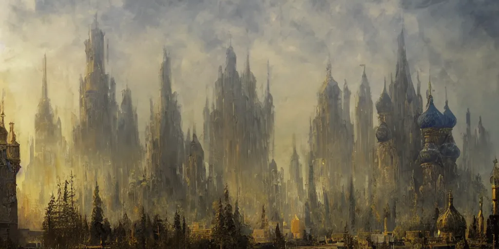bruins of magical ancient Slavic city of Kitezh in mist, magical glow, magic mist, strange buildi...Show more