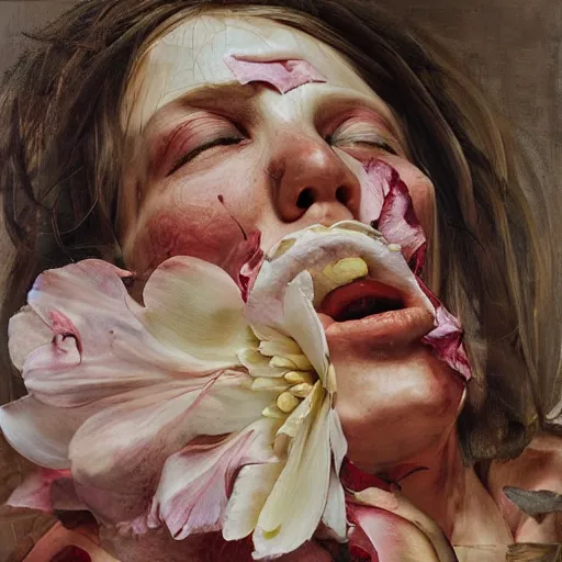 Prompt: high quality high detail painting by jenny saville, hd, a skinny beautiful woman, her face is breaking into pieces, photorealistic lighting
