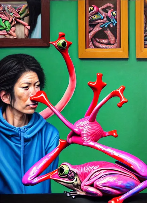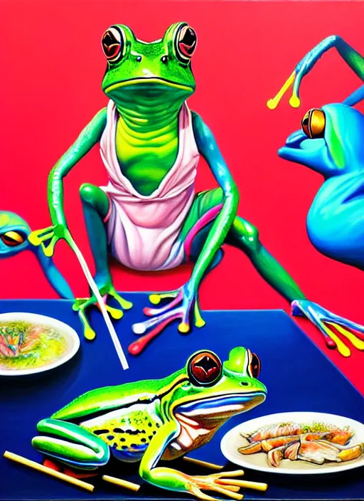 hyper realistic detailed painting of a frog criminal family in japanese clothes in an old italian...Show more