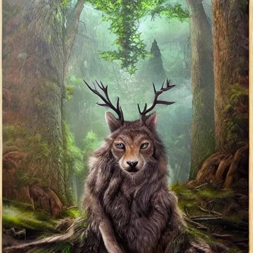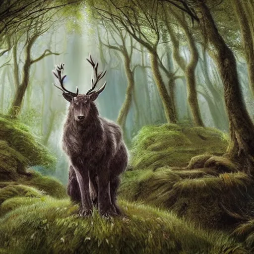 A majestic forest creature is staring at the camera, very detailed, cinematic, epic painting in the style of Lord of the Rings