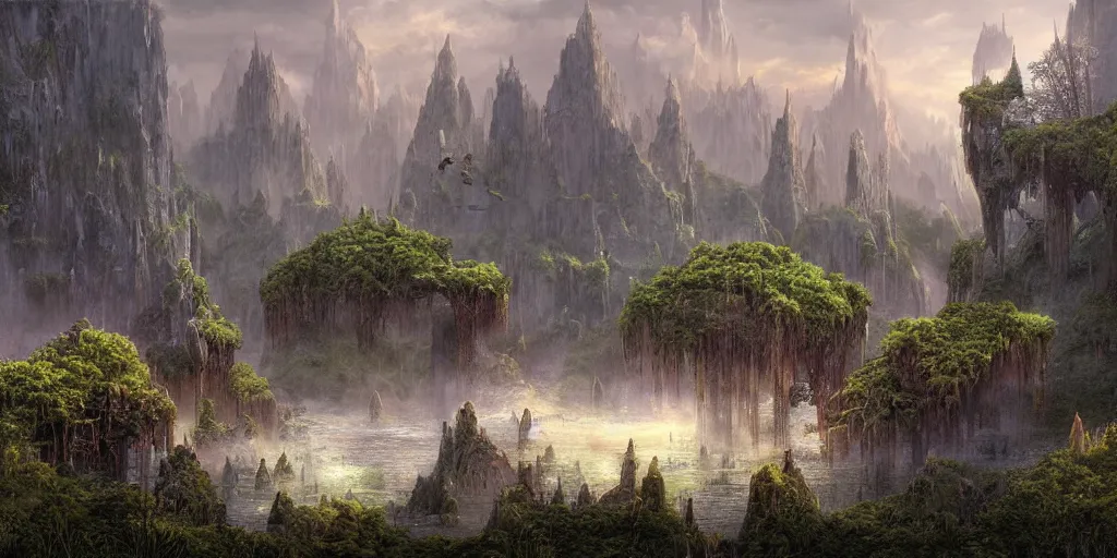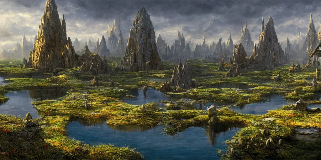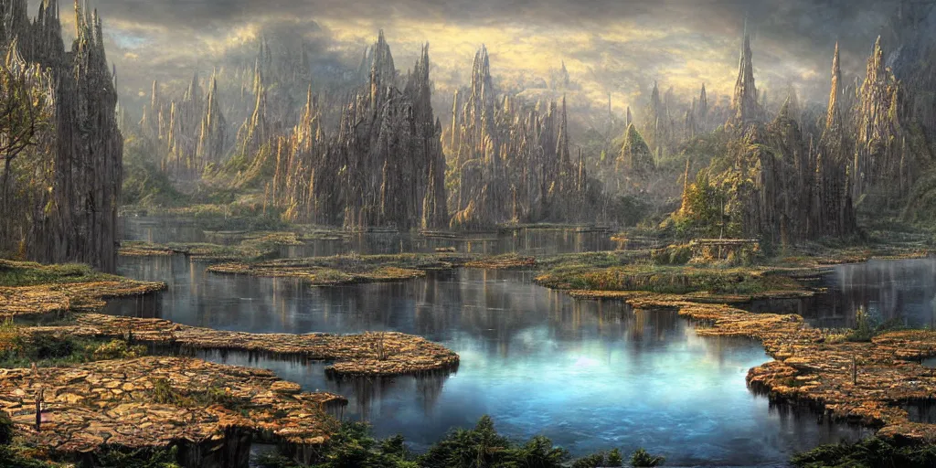 Fantastical open landscape by Ted Nasmith, elven city, city, city, pools of magical water, digital painting, concept art, landscape