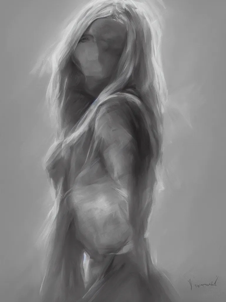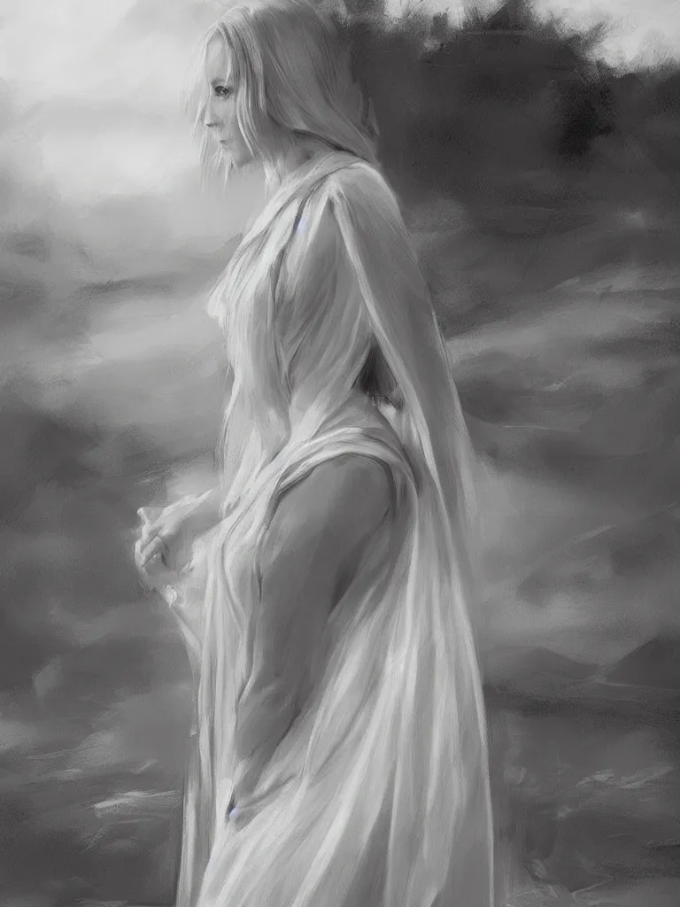 blonde female jedi, Swedish countryside, landscape view, archipelago, pencil sketch, abstract, black and white, mono, by Vladimir Volegov, wlop, artstation