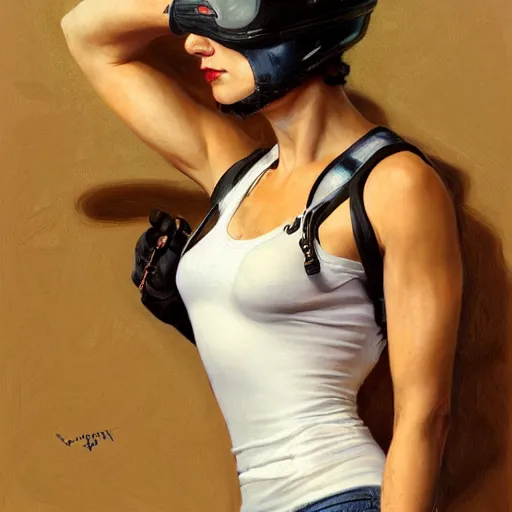 a portrait of a woman wearing a white tank top and wearing lether gloves with black jeans and hel...Show more