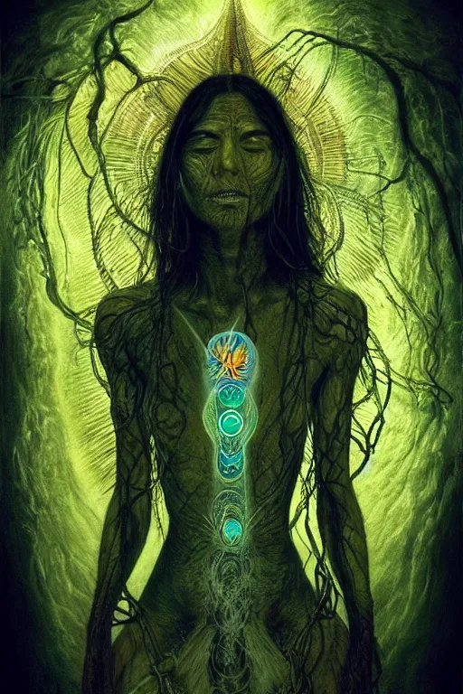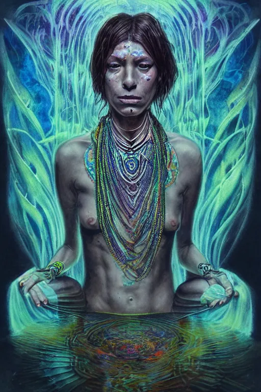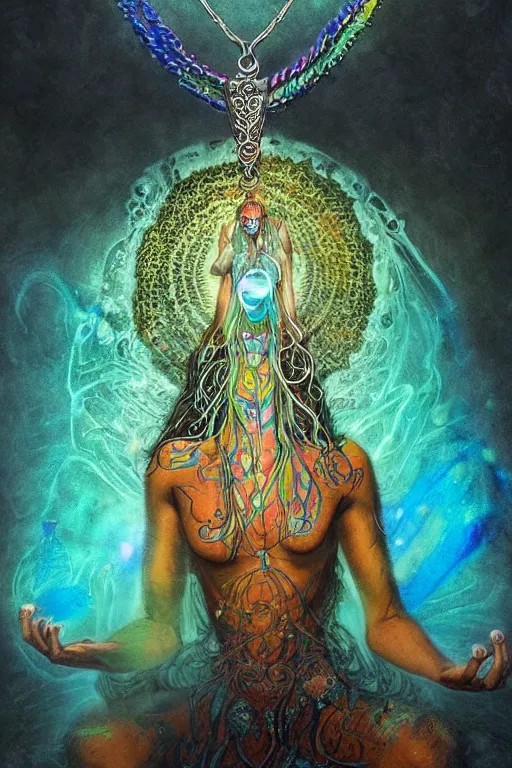 meditating psychedelic shaman with trinket necklace, epic angle and pose, reflective pool, symmet...Show more
