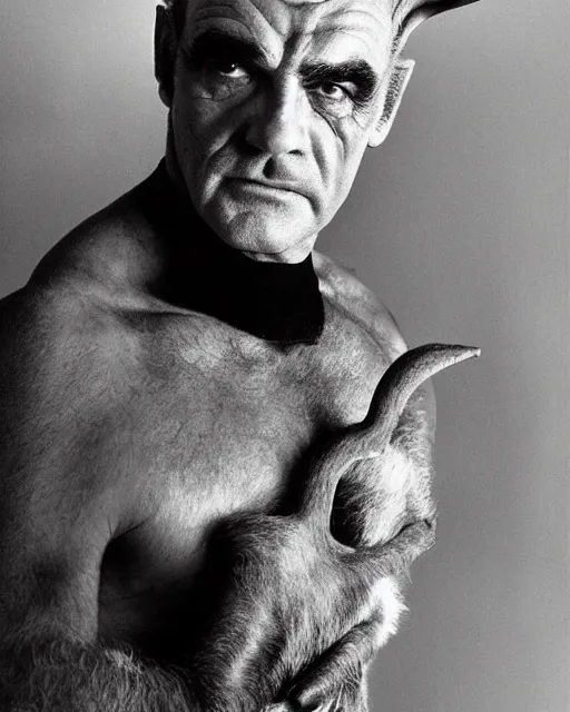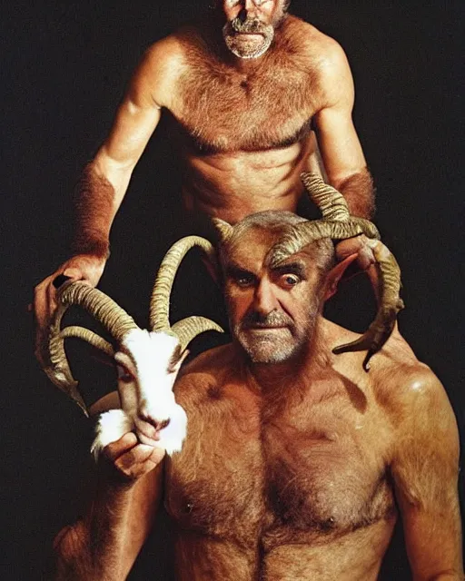 actor Sean Connery in Elaborate Pan Satyr Goat Man Makeup and prosthetics designed by Rick Baker, Hyperreal, Head Shots in the style of Annie Leibovitz