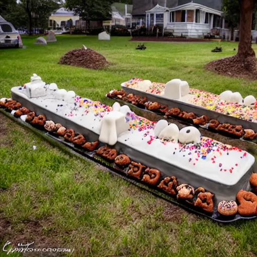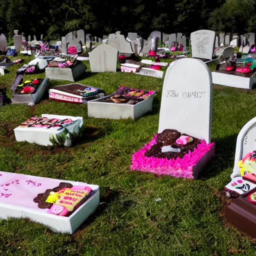 Graveyard made out of desserts. Cookies in the shape of tombstones, cakes that look like coffins,...Show more