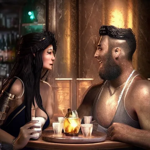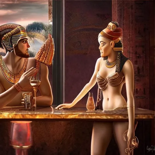 an roman god on a date with Egyptian goddess at a bar Trending on artstation DeviantArt Pinterest furaffinty Photorealistic HD 8k highlights and shadow detailed High Resolution