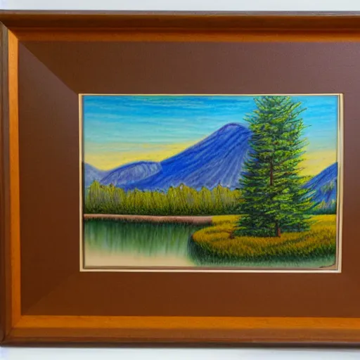 a colored pencil drawing of a tree, a pond, mountain in background, sun rising behind mountains.