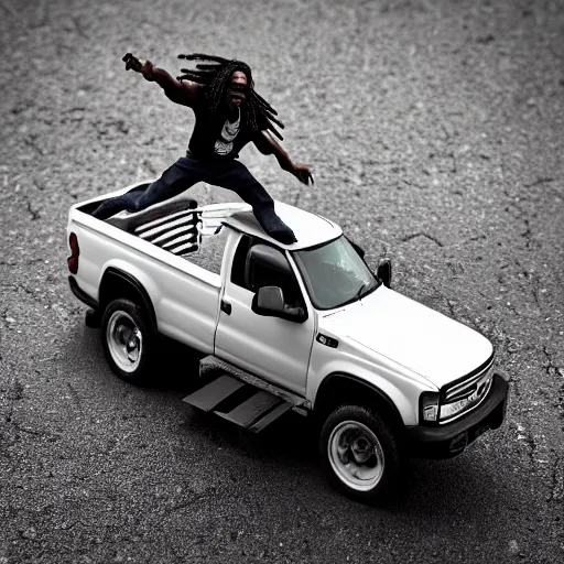 black man action figure with dreads standing on top of a black rc pickup truck, close up photograph, white background