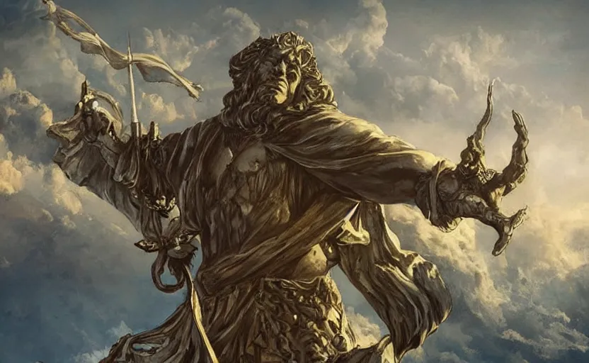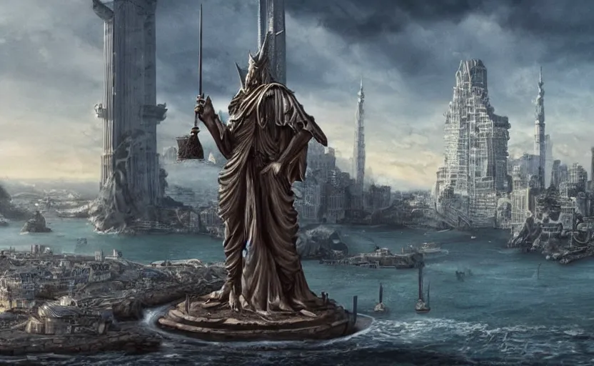 A large statue of a wizard guarding a city, landscape art, concept art, intense, fantasy, inspiring, colossus of rhodes