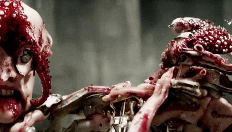 Big budget horror movie, a squid bloodily rips off a cyborgs head