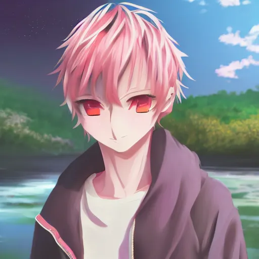cute anime boy standing by a large river,detailed face,detailed eyes,pink lips,upturned nose, dig...Show more