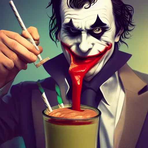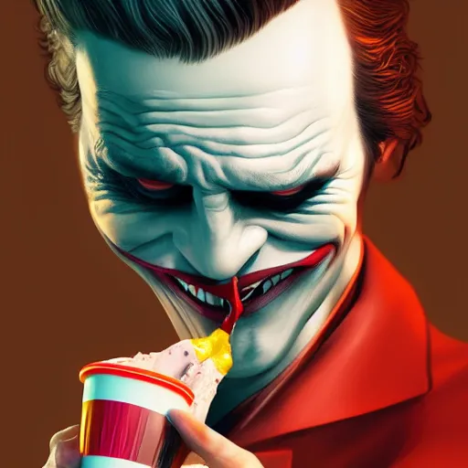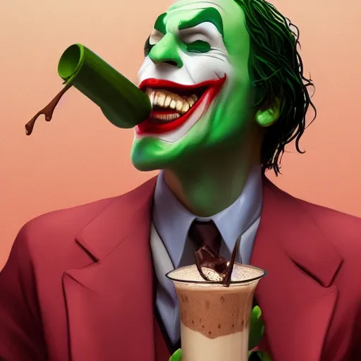 Joker drinking a chocolate milkshake, hyperdetailed, artstation, cgsociety, 8k