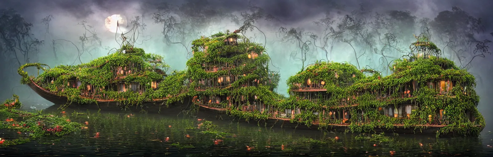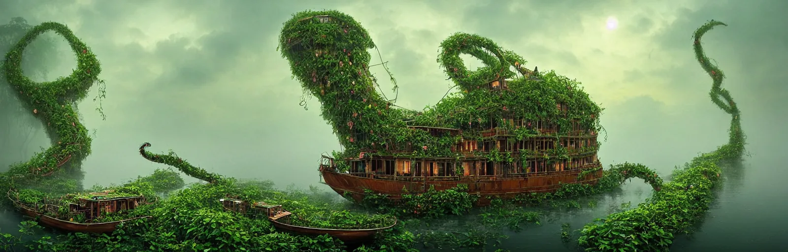 Gediminas Pranckevicius , A wooden, beautiful 1880's steamboat overgrown with intricate vines, fl...Show more