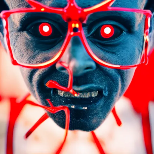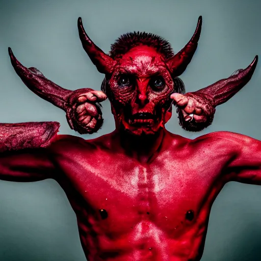 A demon, four eyes, four hands, four legs, red skin, epic lighting, taken with Sony a7R camera, EOS-1D, f/1.4, ISO 200, 1/160s, 8K, RAW, unedited, symmetrical balance, in-frame