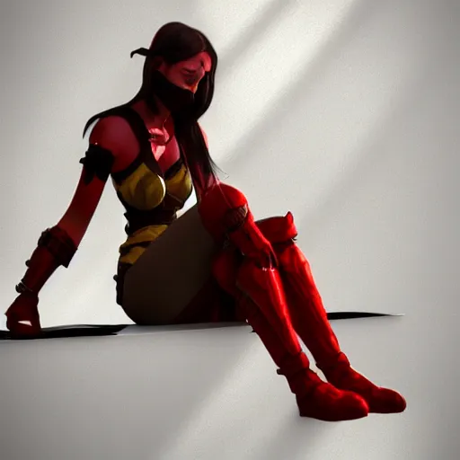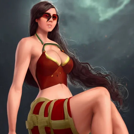 Hot fire giantess, sitting down, lap pillow to masked man, fire in hand, warrior queen, concept art, artstation, 4k