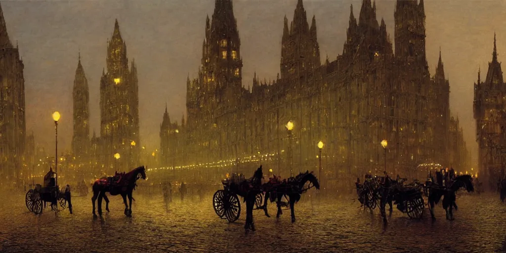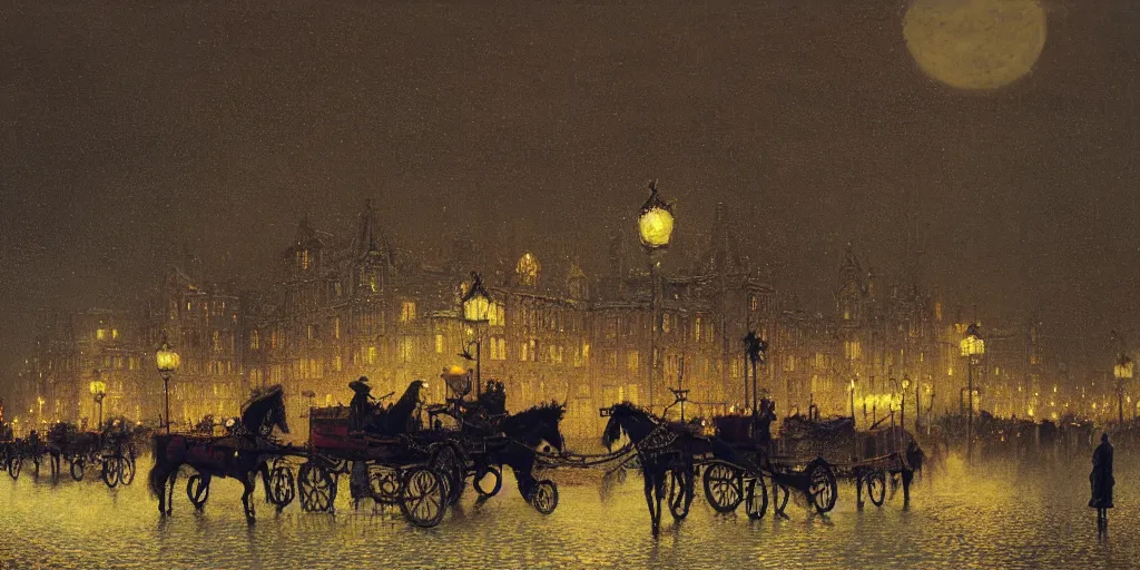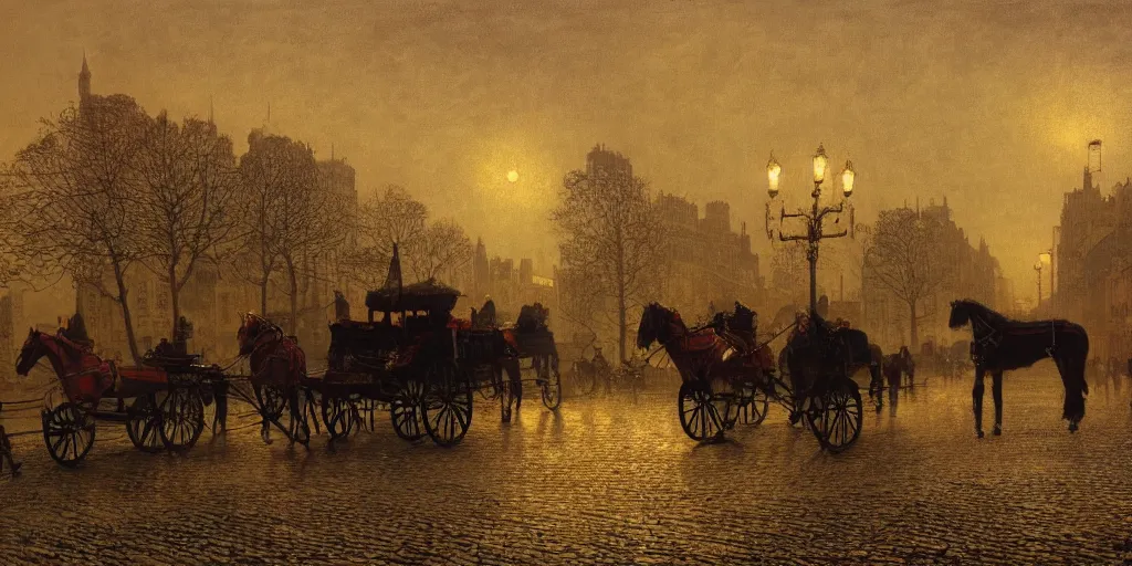 Horse carriages, evening, detailed matte painting, cinematic, John Atkinson Grimshaw, Artstation