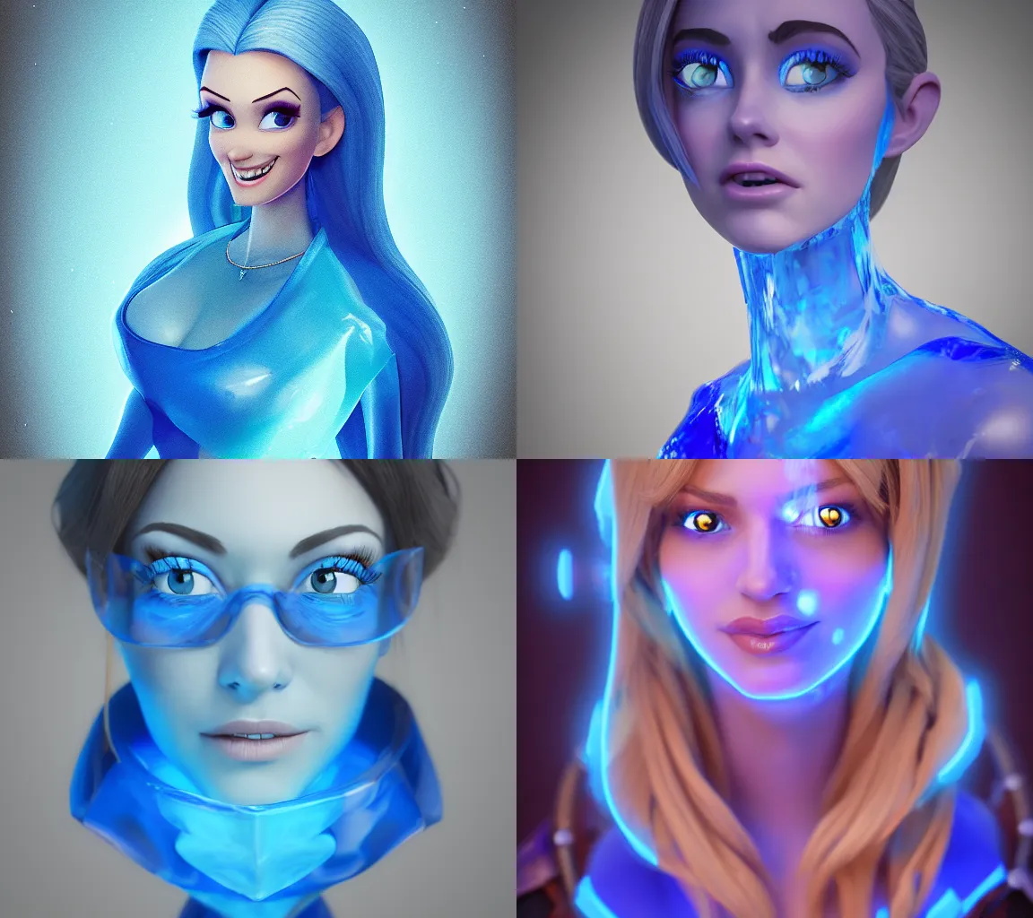 Portrait, beautiful woman made entirely of translucent blue ice, hearthstone style, pixar, 3D render 8k