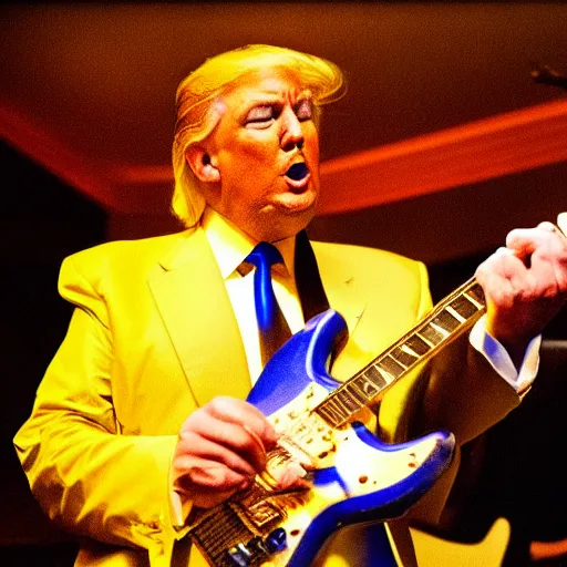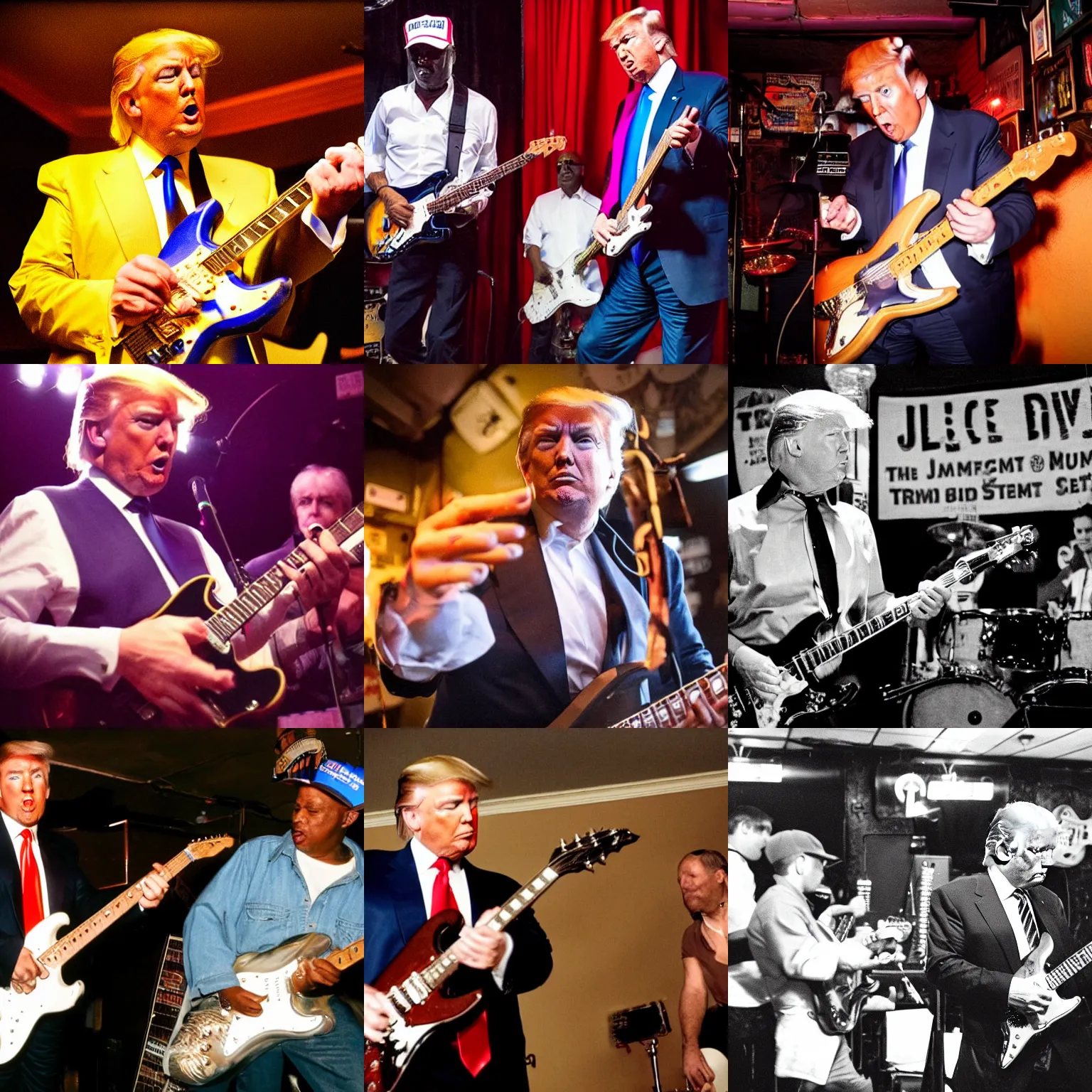 Donald Trump as a blues musician playing electric guitar at a jam in a dive bar