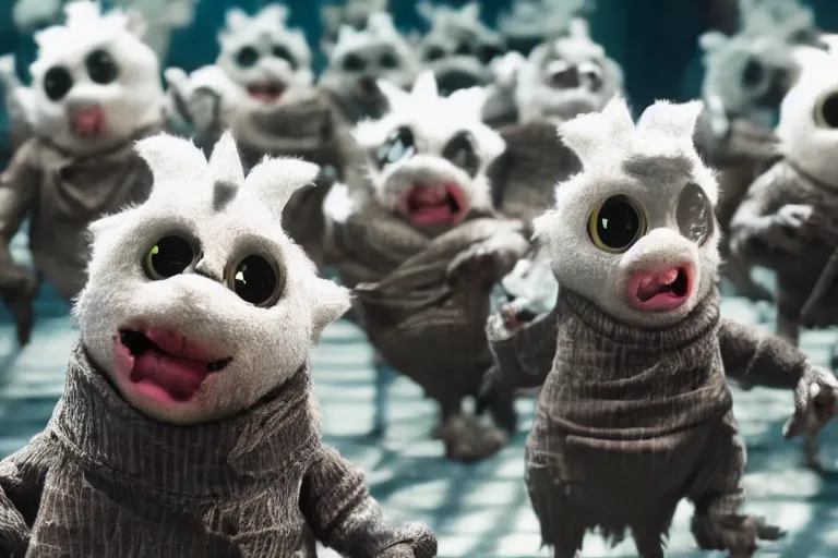 a cinematic still of meeboo bohtrops, shmiggle biggles in the bleem podorkers, closeup
