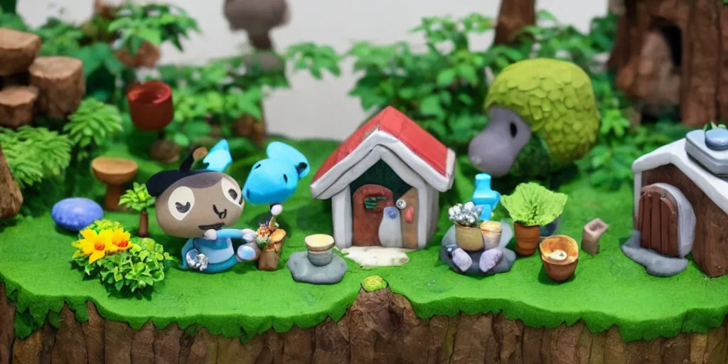 Animal Crossing Village Diorama, polymer clay, moss, plants, cottagecore