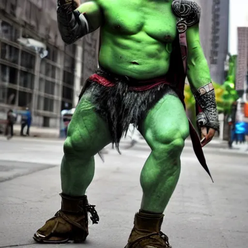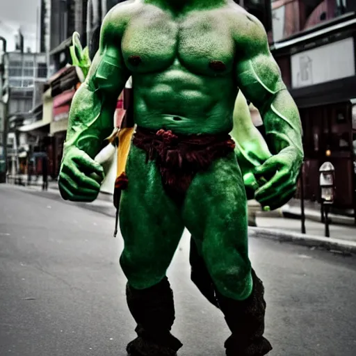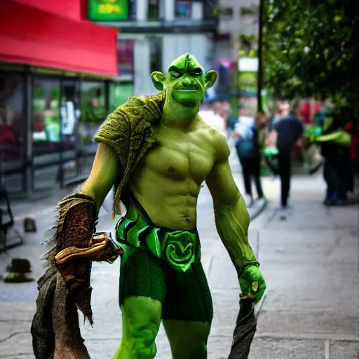 a friendly green-skinned half-orc in the city, casual clothing, today's featured fantasy photography