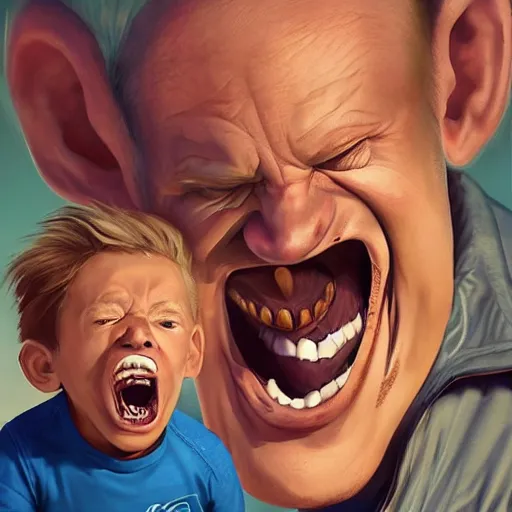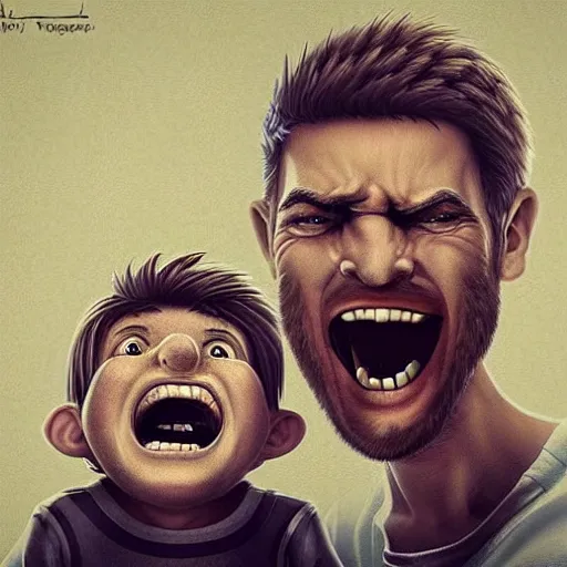 Father yelling energetically with a big mouth at his little son who keeps his head down., exagger...Show more