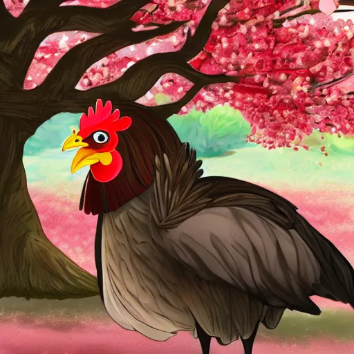 a humanoid chicken in samurai armor resting under a tree with sakura petals