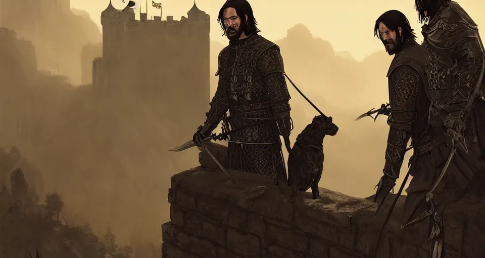 john wick and Simon peck as medieval bowmen, standing on a gothic style castle wall, overlooking...Show more