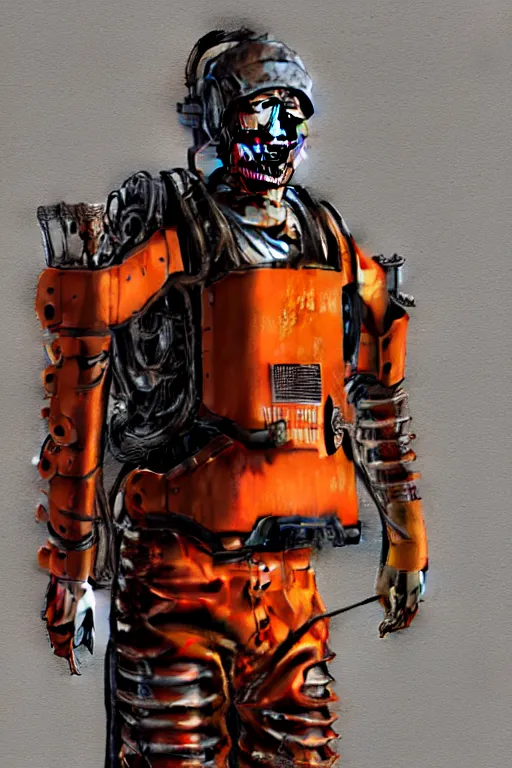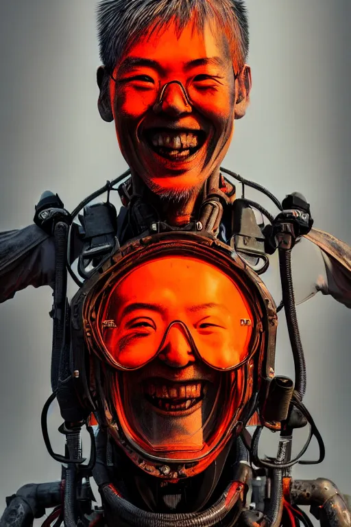 hyperrealistic grungy exoskeleton!! smiling chinese man covered highly detailed concept art eric zener elson peter cinematic hard orange lighting high angle hd 8k sharp shallow depth of field