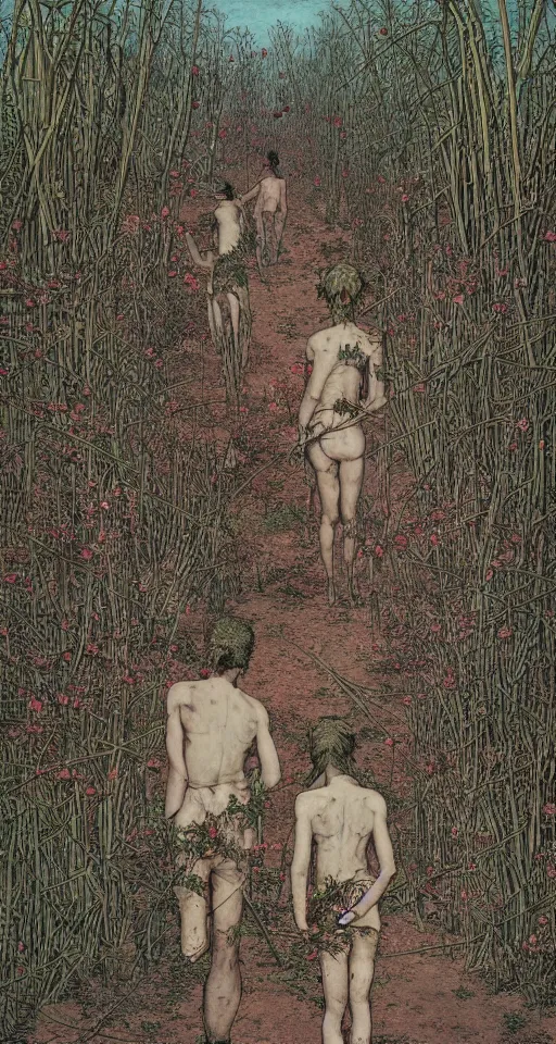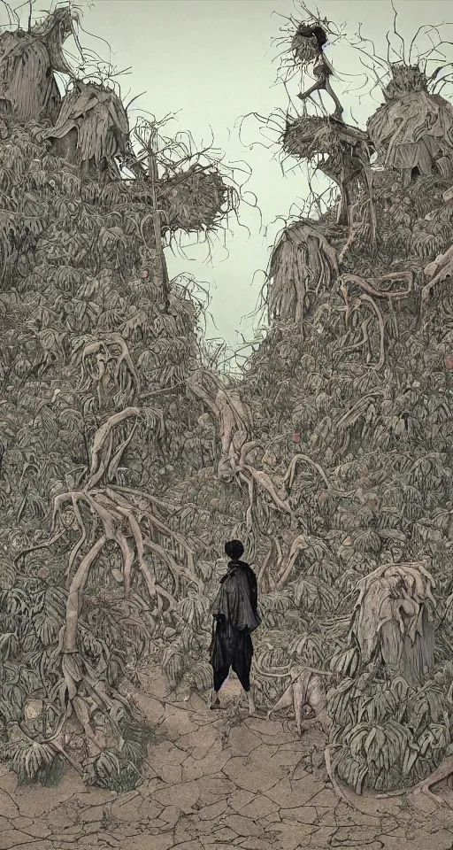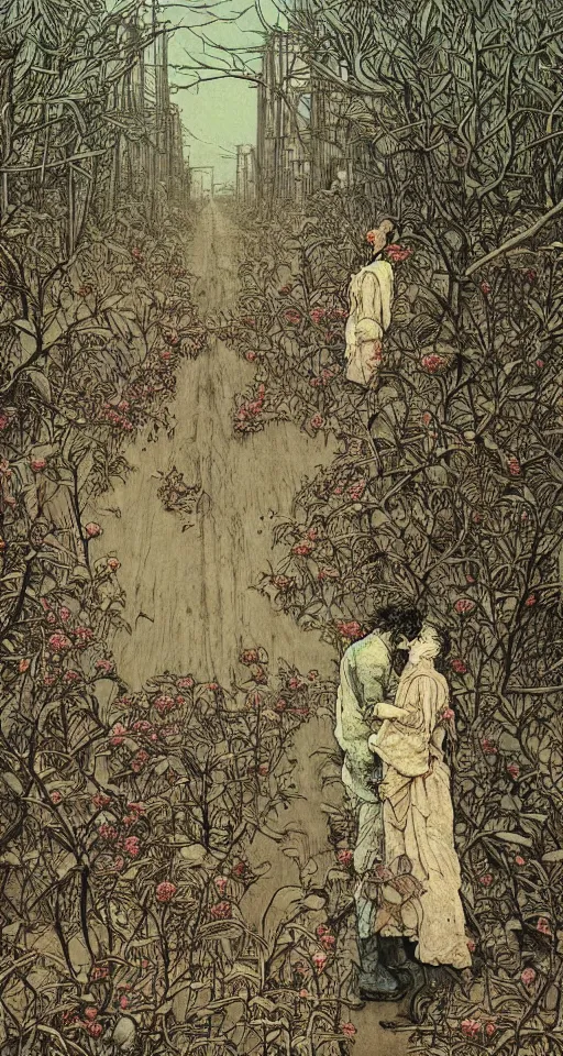on the street of abandoned town 2 people standing huddled together, spiny giant plants bursting t...Show more