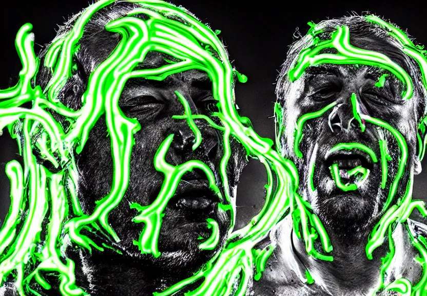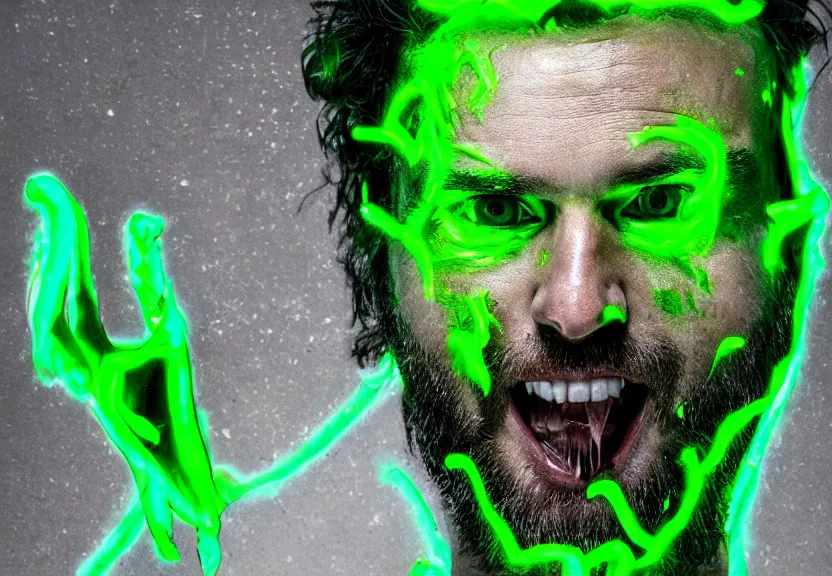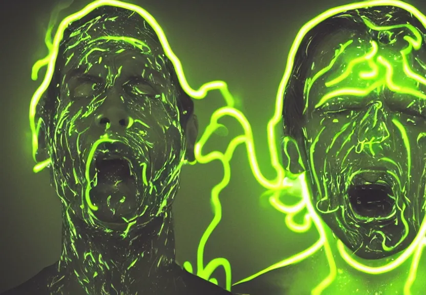 a ultra realistic photograph of a man's face being melted off with oozing neon green and white honey