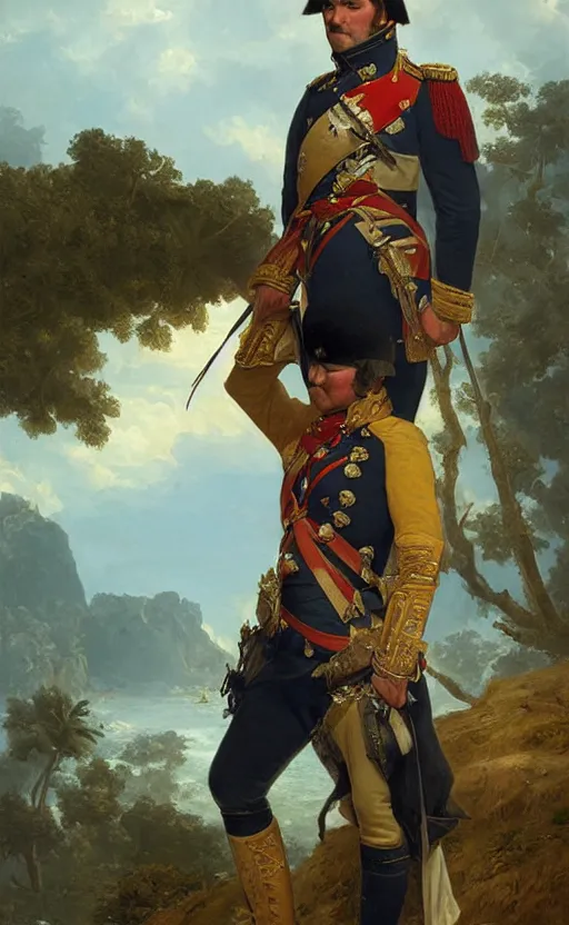 Portrait of a napoleonic army officer overlooking a tropical island, male, detailed face, 19th century, highly detailed, cinematic lighting, digital art painting by greg rutkowski