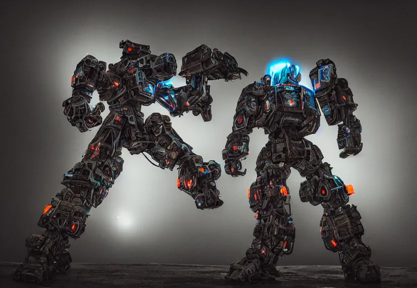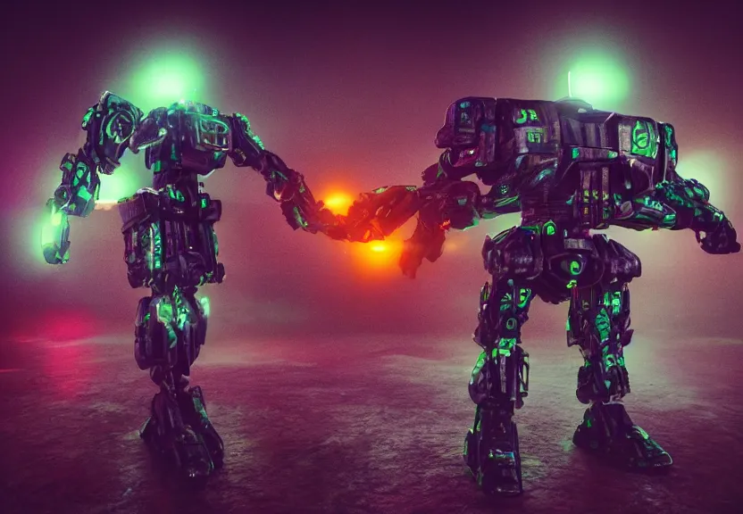 a ultra realistic hyper realistic underexposed film photograph of an intricate neon mech warrior