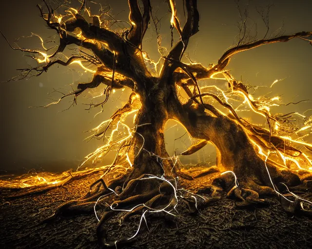 angry complex strings and cables electricity fight, action scene, sad face tree roots strangled,...Show more