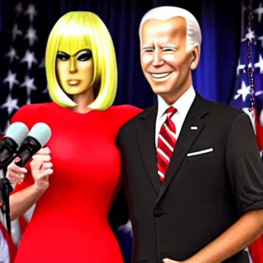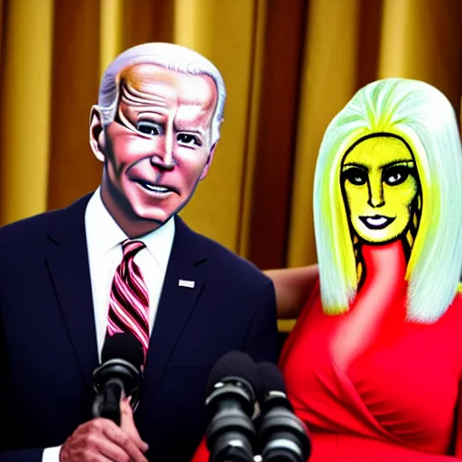 photograph of a an alien wearing a blond wig and a red dress and ((Joe Biden)) at a press conference