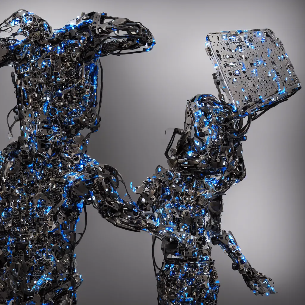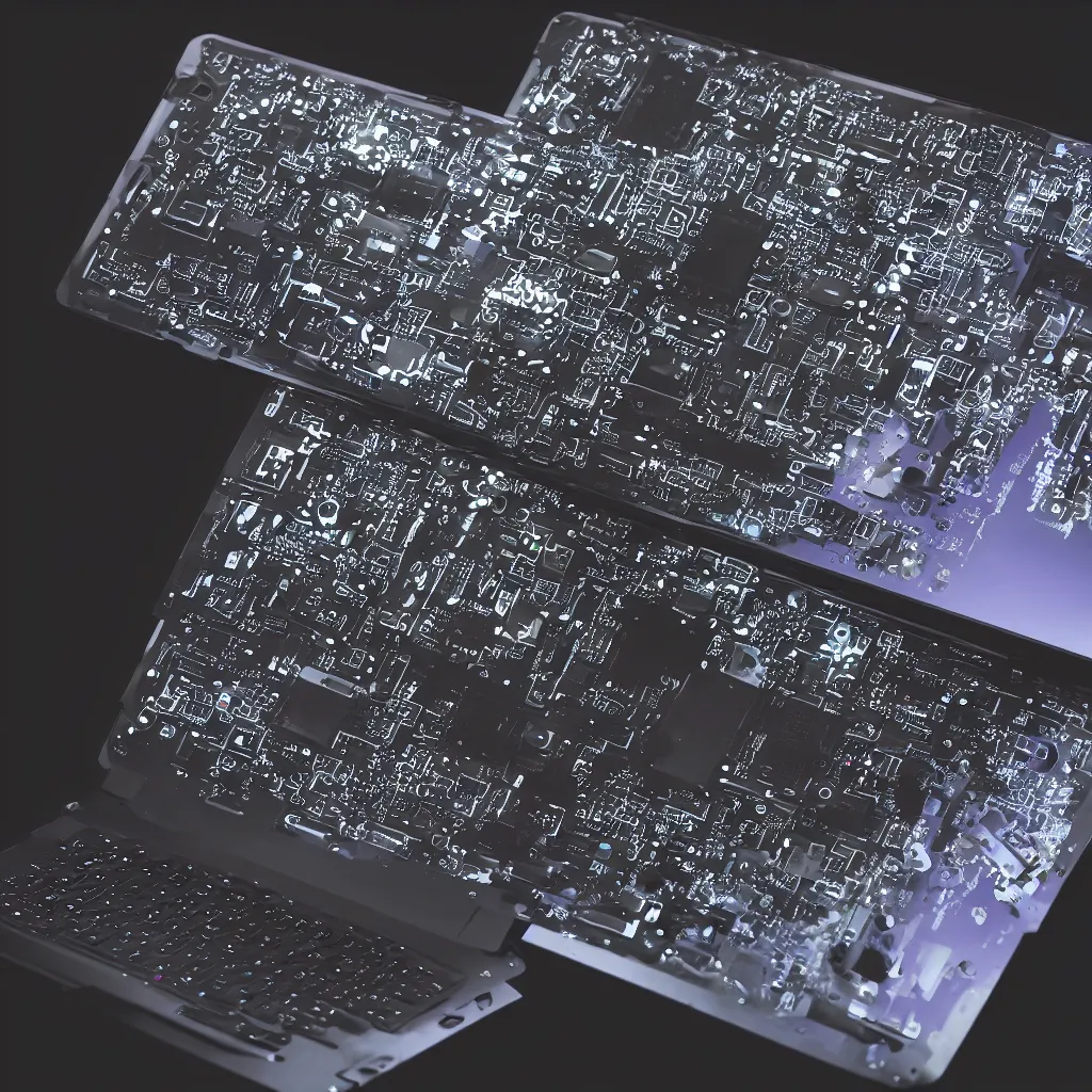 generative design exoskeleton laptop computer, dark plastic, pcb internals, glowing lights, product shot, depth of field