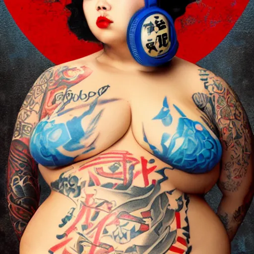 super model with 1930s gas mask, Japanese yakuza tattoo all over her curvy body , blue and red ta...Show more