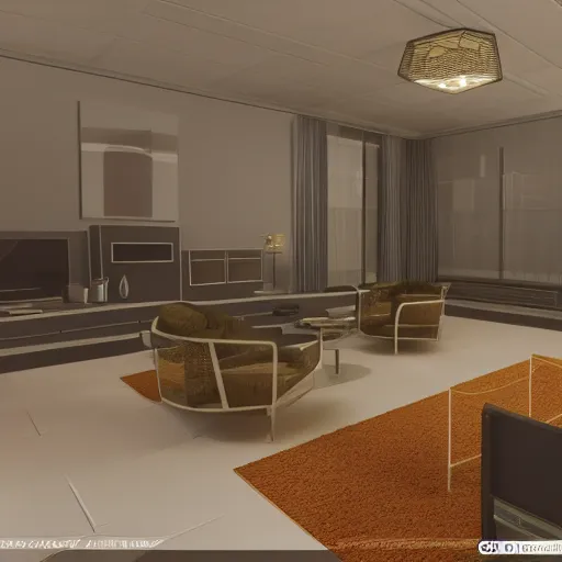 simulated mesh render of a 70s interior with no textures, computer simulation rendered in high detail, 8K UHD