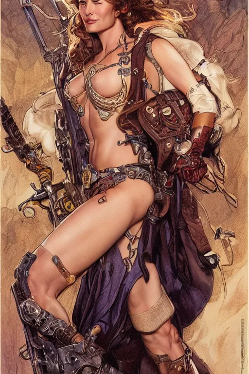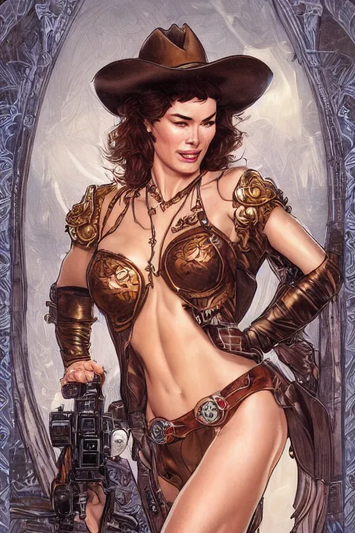 bombshell cowgirl who looks like lena headey, detailed full body portrait by james gurney and artgerm and Mucha, amazing detail, intricate, stunning inking lines, 4K, character design, concept art