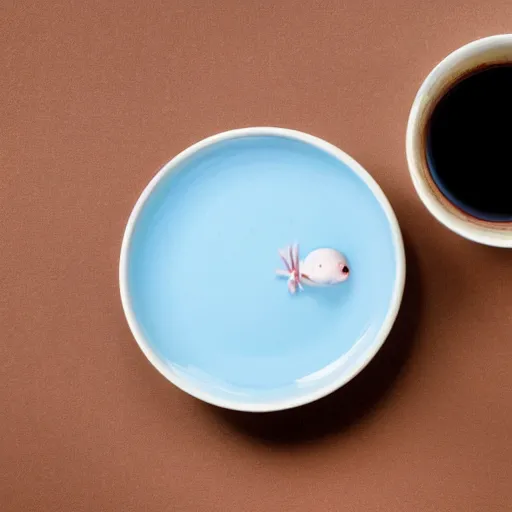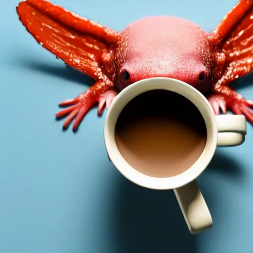 An axolotl peeking out of a cup of coffee, light blue background