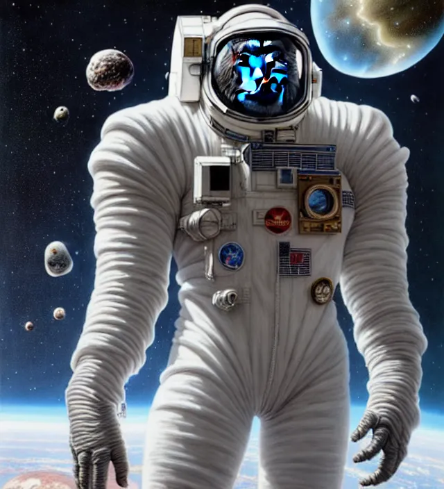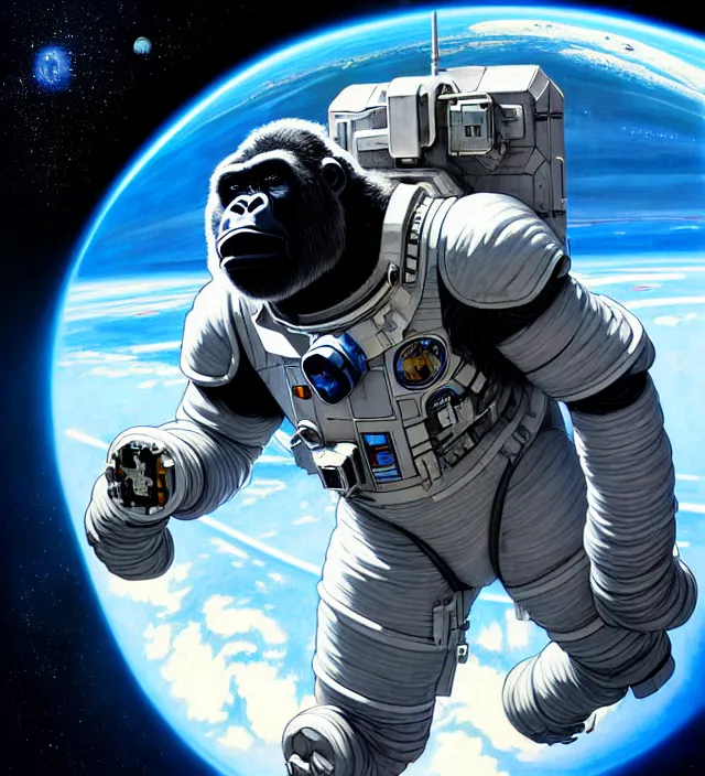 a highly detailed science-fiction character portrait of a serious gorilla wearing a white armored...Show more