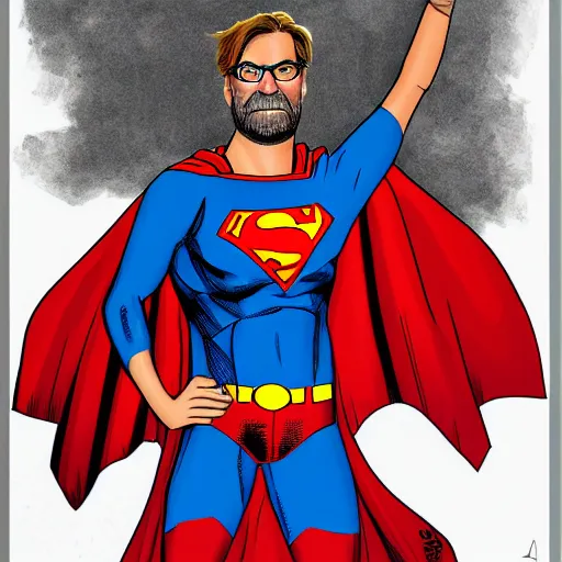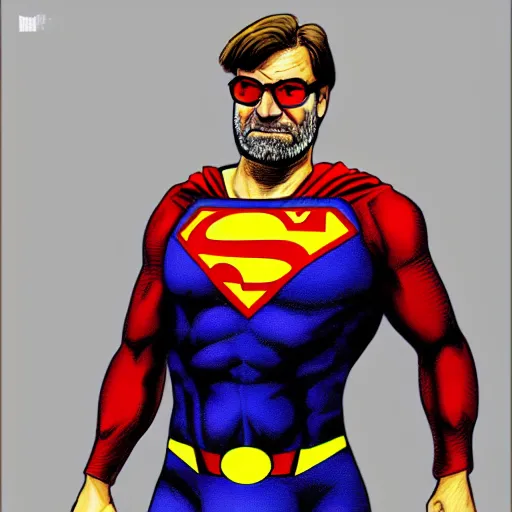 Jürgen Klopp wearing a superman custom by Bryan Hitch, comic, dramatic, 4k, trending on artstation