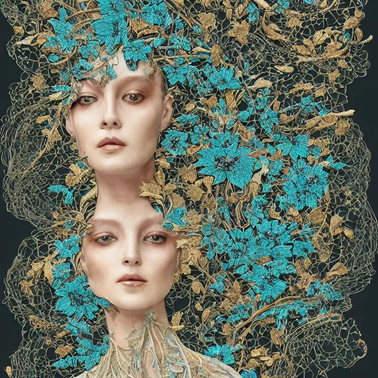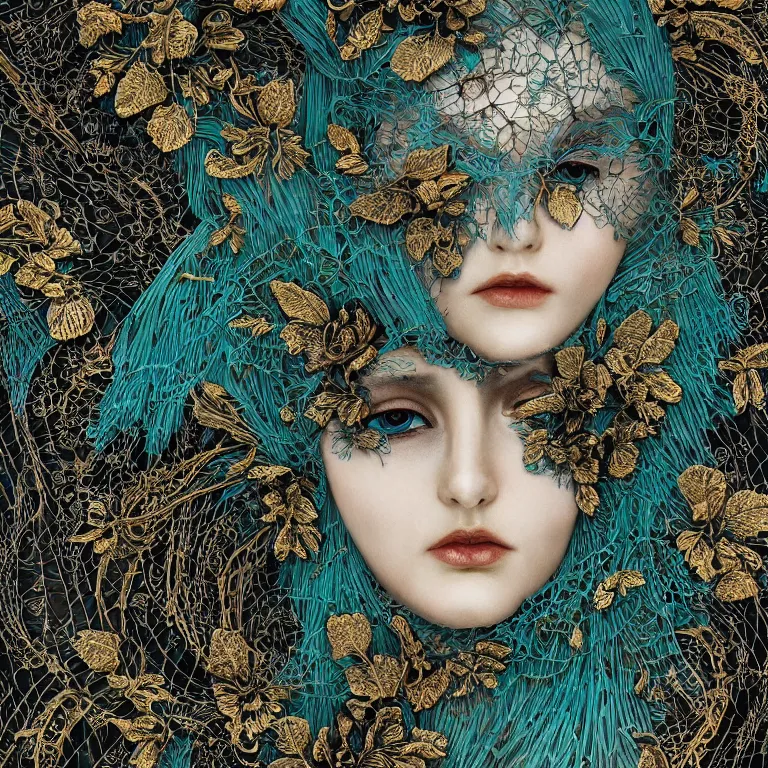 dark scene, ultra detailed, of a porcelain woman's face made of big leaves and large Dragonflies,...Show more