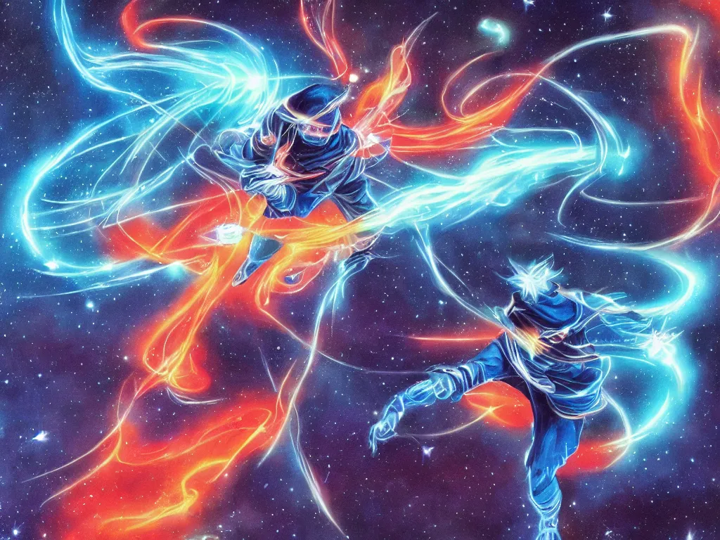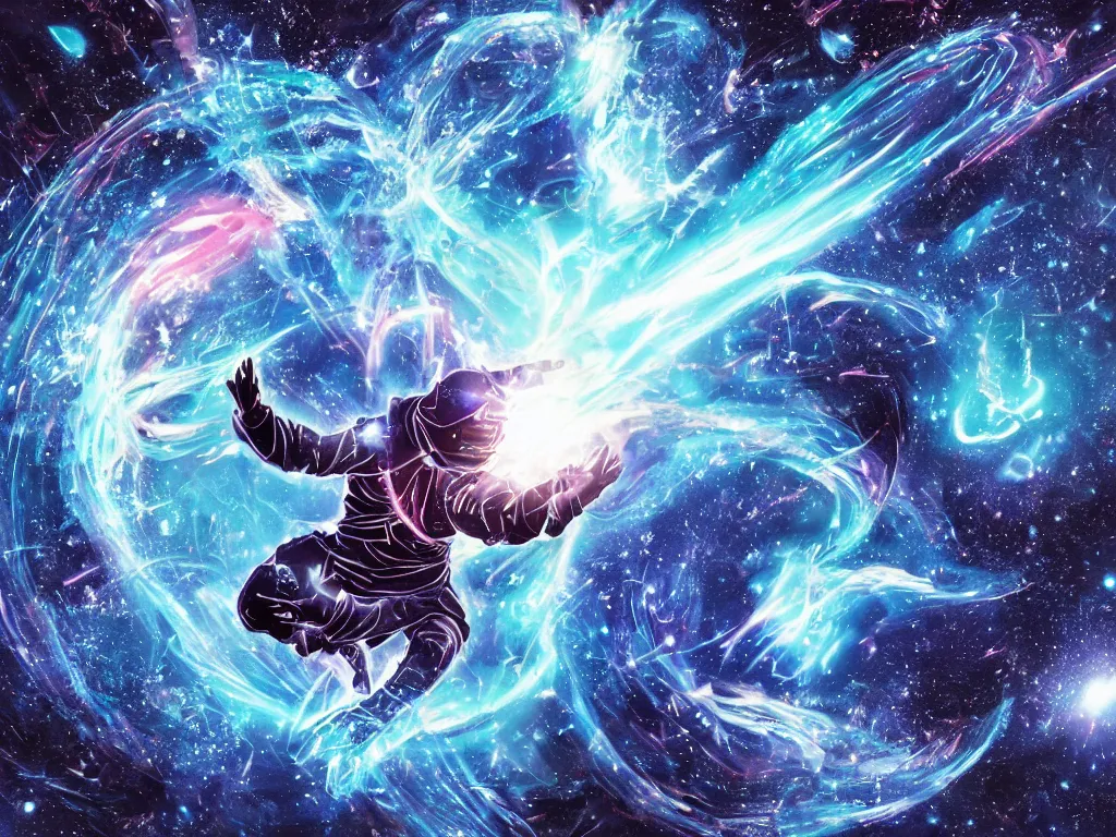 A cosmic ninja running through a blue light of transformation