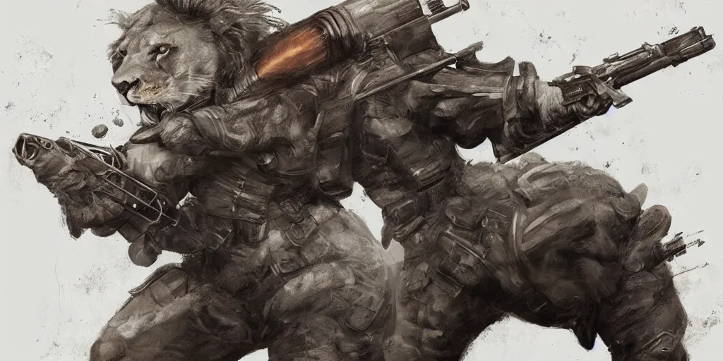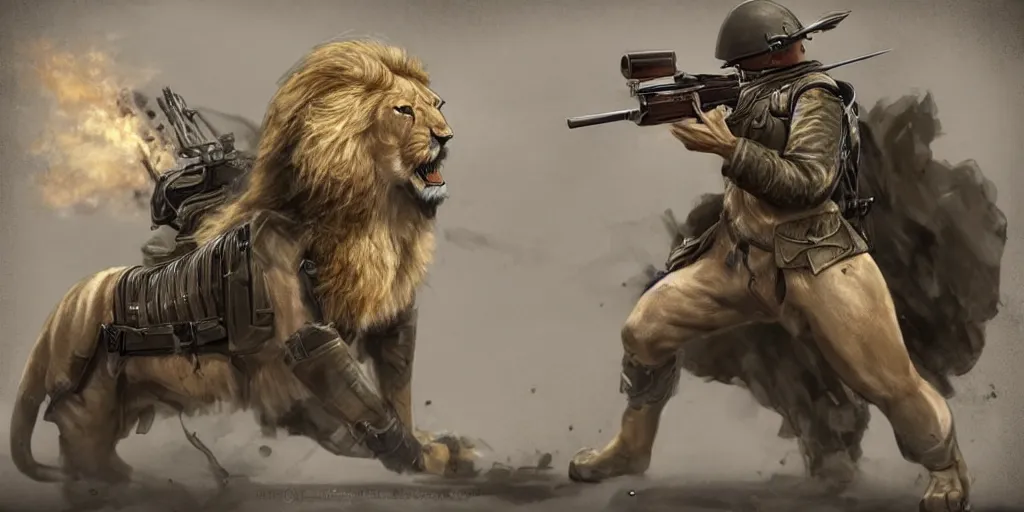 Full body concept art of A High fantasy WW1 lion firing a heavy shotgun trending on artstation deviantart Pinterest detailed High Resolution HD 8k