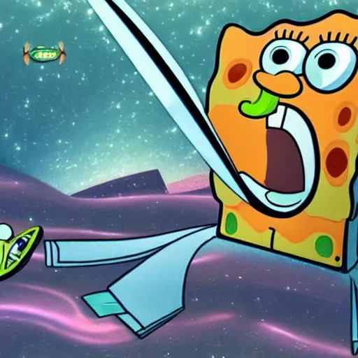 Prompt: spongebob fighting goku in space, digital art