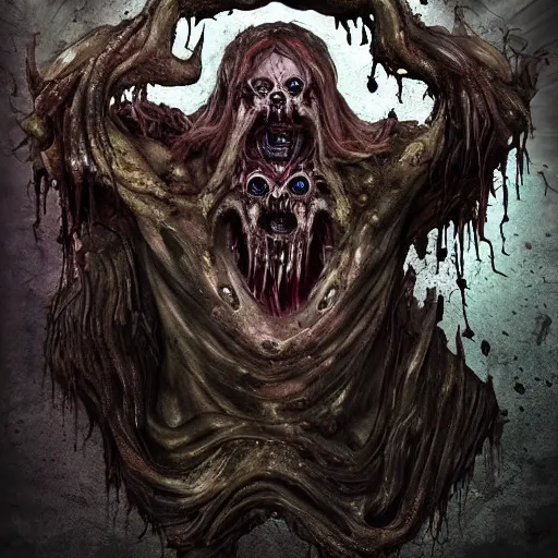 god of decay and rot, character design, scary, radiating with power, glowing eyes, whirling death, disgusting, dripping, oily, decomposition, ghostly mist, scary, unreal engine, photorealistic