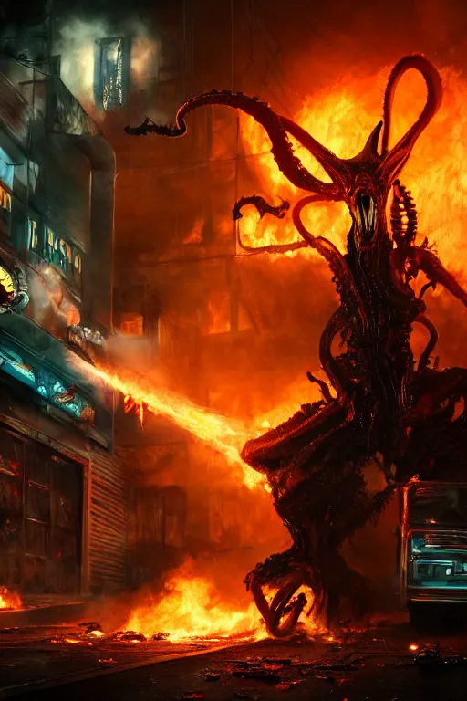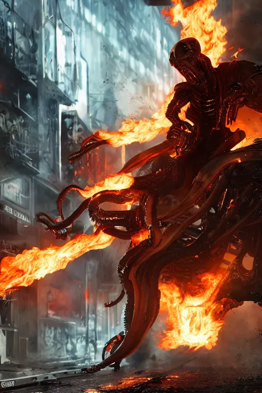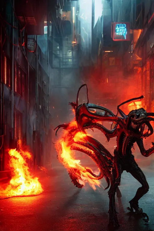 The Ghost Rider fights a fire-breathing xenomorph in the back alley of a cyberpunk city, burning trash flies through the air, splattered blood. Realistic, octane render, trending on ArtStation.