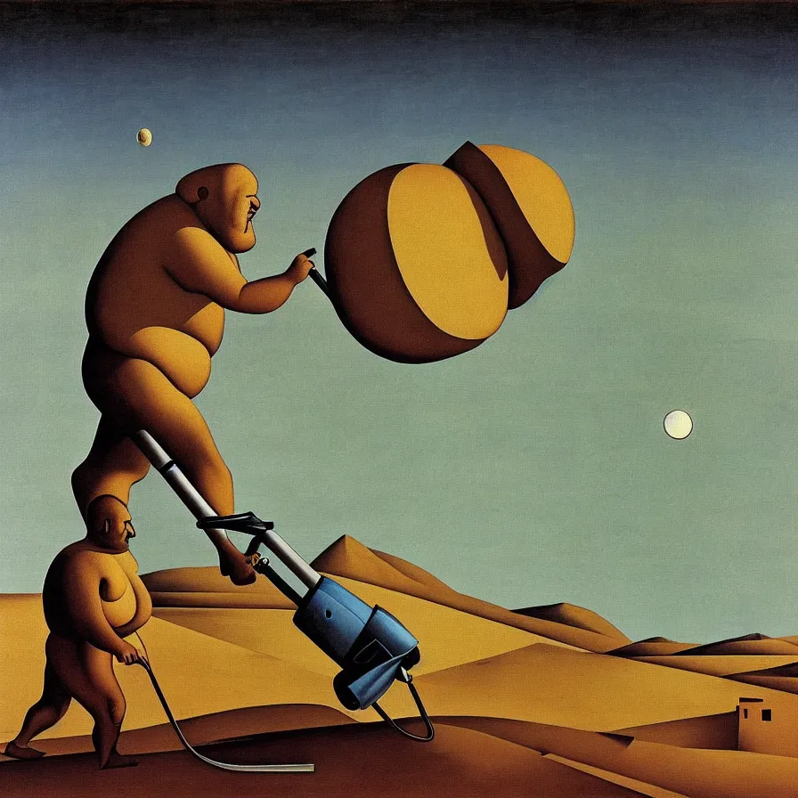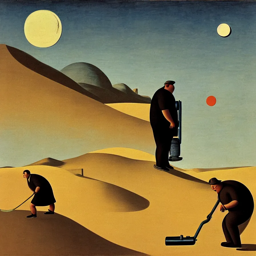 a fat man pushing a vacuum cleaner through the desert . It's night time and there is a full moon. In the background we see hills. surrealist painting , Giorgio de Chirico